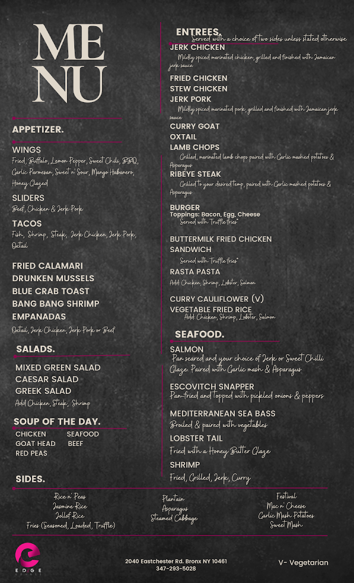 Welcome to Edge Restaurant & Lounge, an exciting culinary destination located in the Bronx at 2040 Eastchester Rd. This vibrant establishment offers a delightful blend of Caribbean and contemporary flavors, all within a creative ambiance that sets the stage for memorable dining experiences.